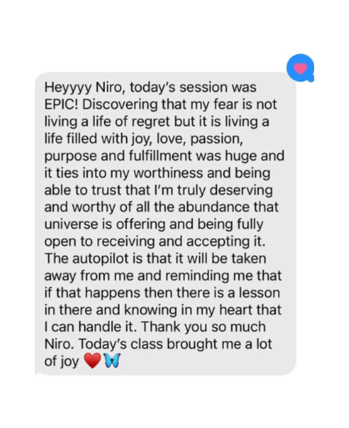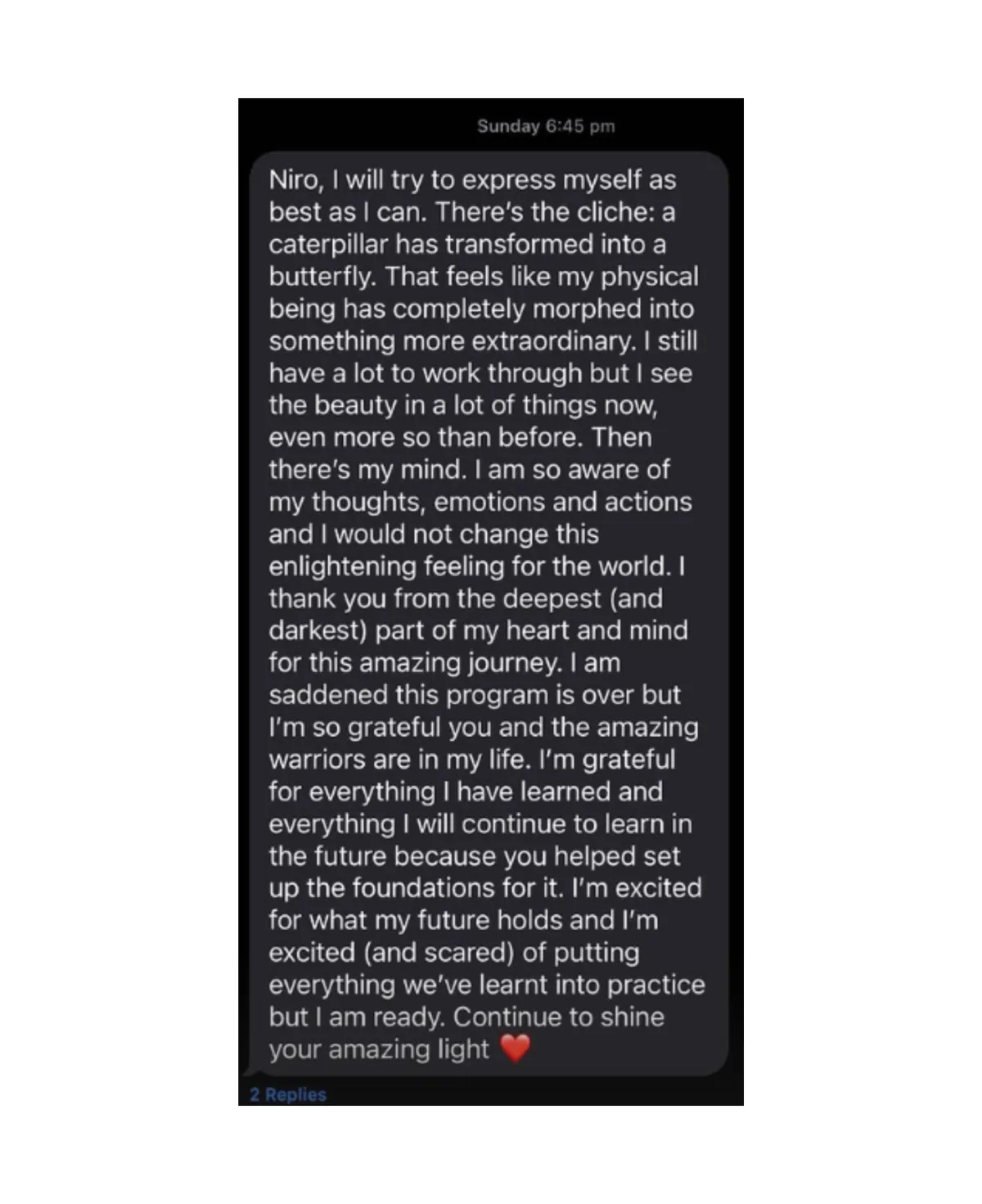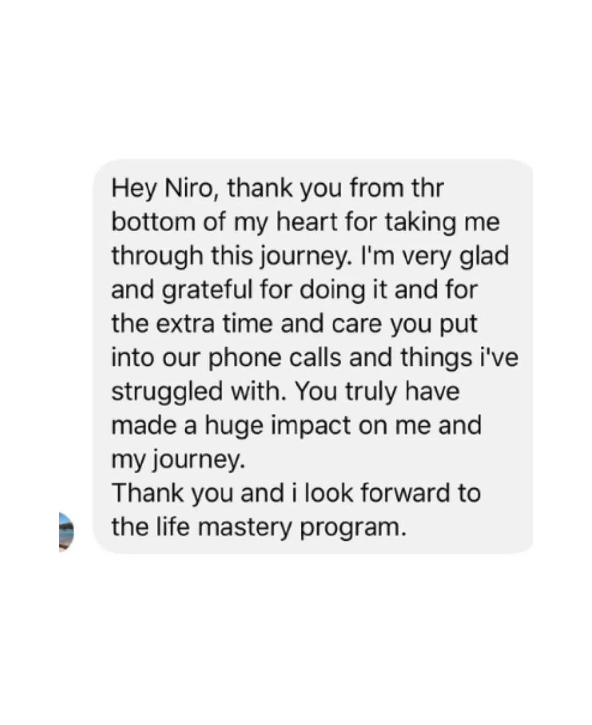 Yes, you will be working directly with Niro. And will you also have access to other specialist coaches in areas outside Niro's specialties. Eg - Women in Leadership, Gut & Nutrien Health & Parenting.